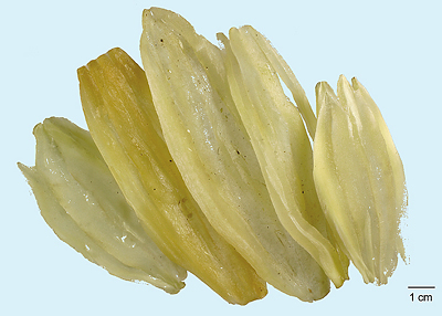Oblong and spindle-shaped, slightly curved; 5-18 cm long, 0.5-2 cm in diameter. Outer surface yellowish-white to pale yellowishbrown; translucent; smooth or marked with longitudinal wrinkles of varying depths, and occasionally with remnants of greyishbrown cork. An opaque fine woody core visible when held against the light. Hard, or soft and smooth; sticky. When broken, surface cuticular, with a yellowish-white stele. Odour: faint; taste: sweet and slightly bitter.